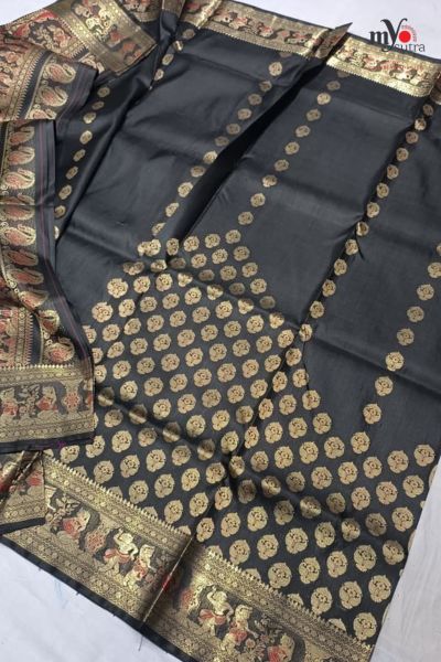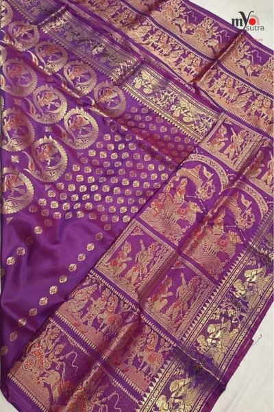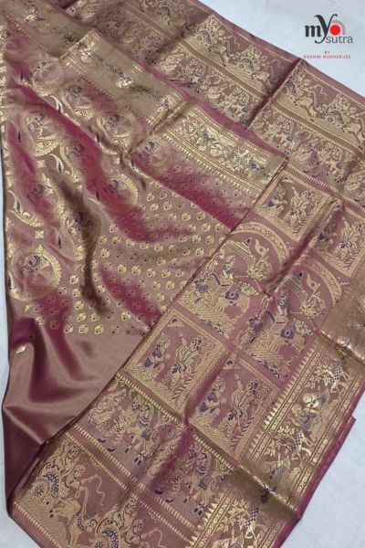 Introducing Myosutra’s Exclusive Pure Bishnupuri Swarnachori Katan Silk Saree — a masterpiece born from the historic looms of Bishnupur, West Bengal. Known for its intricate storytelling motifs inspired by temples, mythology, and cultural heritage, this saree is not just attire — it’s wearable art.