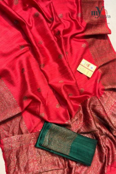 Unlike regular silk sarees, Tussar silk has a distinct textured feel and breathable quality, making it both comfortable and regal at the same time — a true statement of heritage luxury.