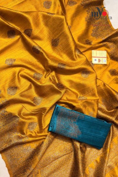 Experience the richness of tradition with Myosutra’s Pure Tussar Banarasi Silk Saree (Silk Mark Certified) — a perfect blend of Banarasi grandeur and Tussar silk elegance. Known for its natural texture and subtle sheen, Tussar silk offers a breathable yet luxurious drape, making it ideal for both festive and wedding wear.